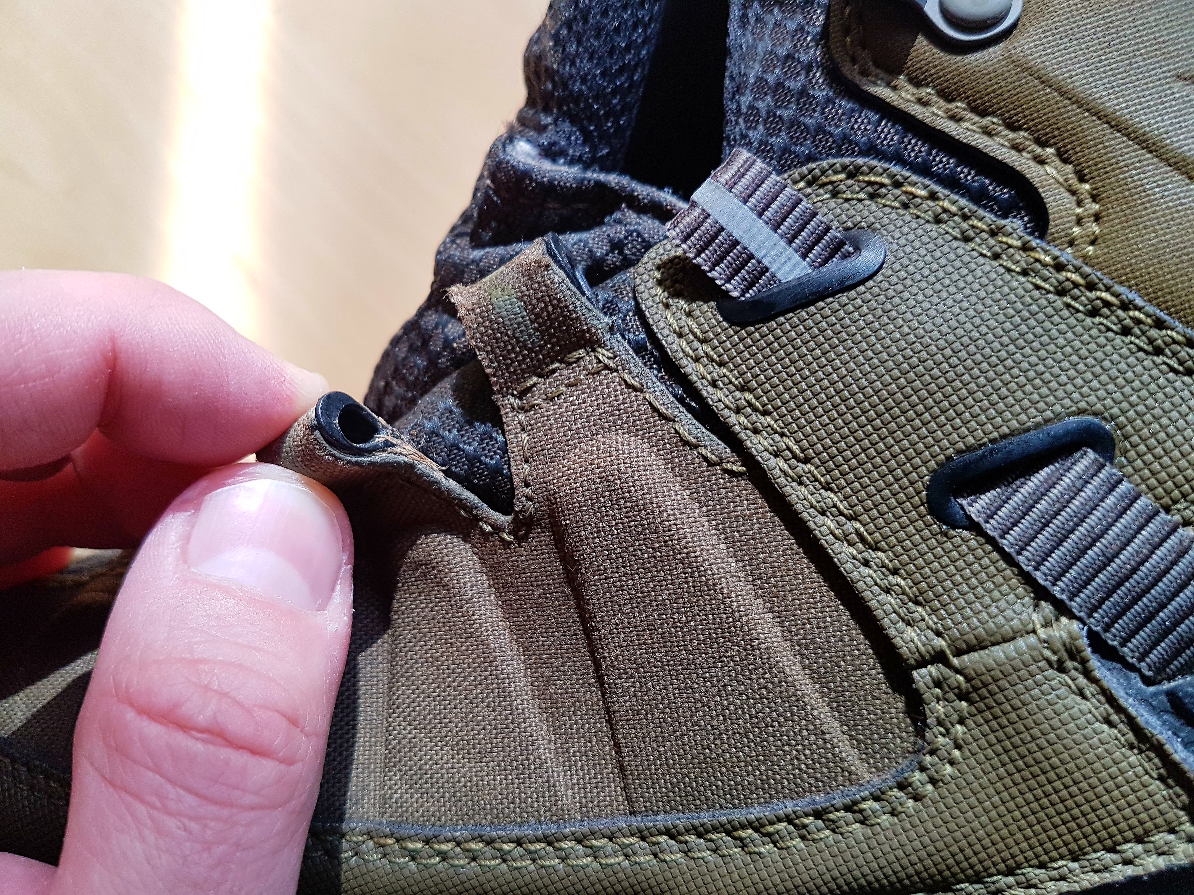 Testowane Keen Targhee EXP mają bardzo odchudzoną wagę. But jest po prostu niewiele cięższy niż sandały. Projektanci zrobili naprawdę dużo żeby usprawnić ten model i zredukować wagę. Cały but zbudowany jest z gęsto tkanej nylonowej tkaniny co już stanowi spore odchudzenie wagi. Poprzednik był zbudowany ze skóry. System wiązania sznurowadeł jest również bardzo odchudzony. Stanowią go pętelki z nylonu z tej samej tkaniny z której uszyty jest cały but. Te przelotki na których sznurówki pracują najbardziej są dodatkowo wyłożone plastikiem. Ostatni element wiązania buta u góry, który stabilizuje kostkę i staw skokowy jest haczykiem wykonanym ze bardzo mocnego plastiku. But w rozmiarze EU 44 czyli US 10,5 o długości wkładki 285 mm waży zaledwie 520 gram. I to w wyższej wersji Mid, do kostek.