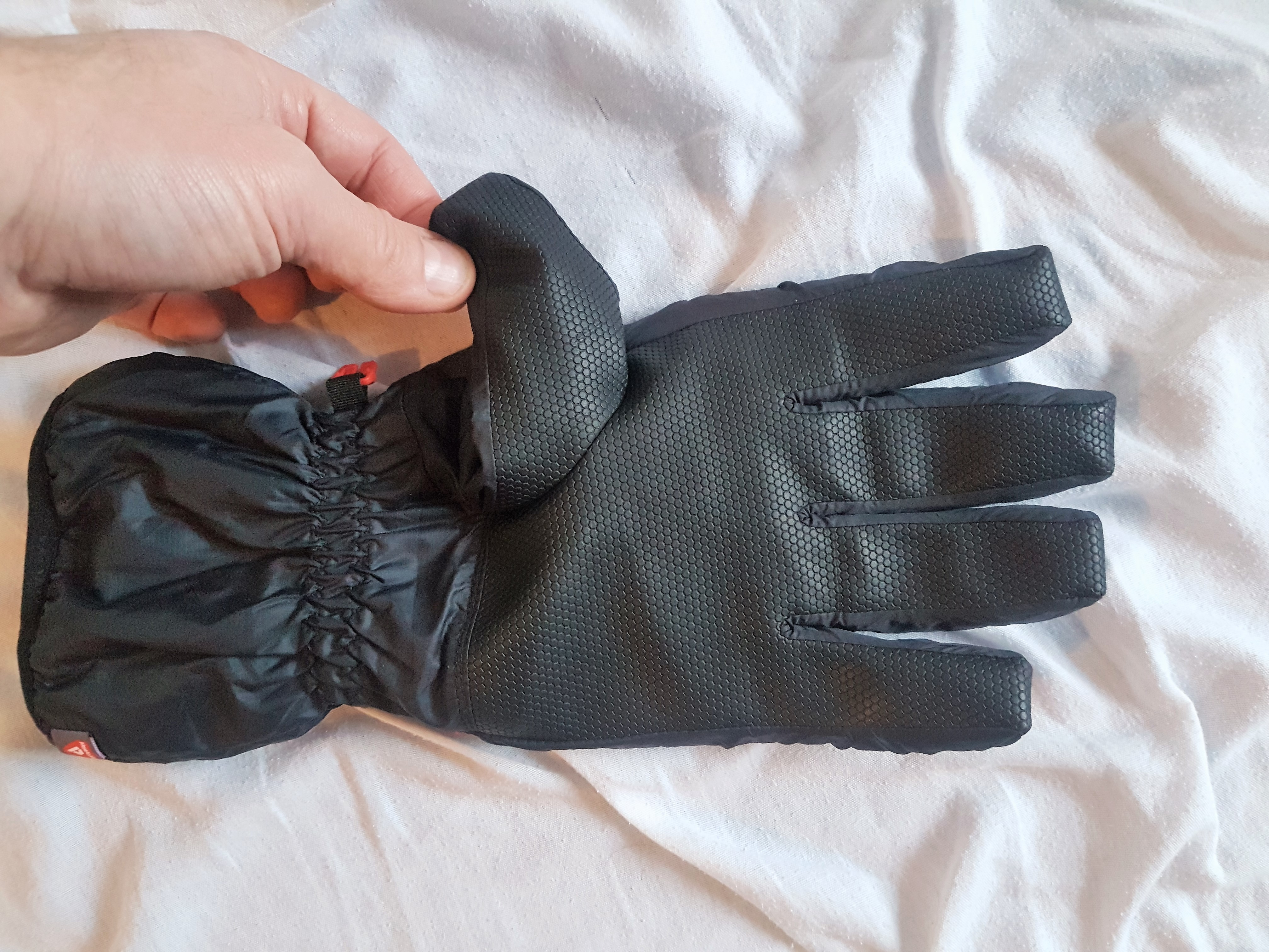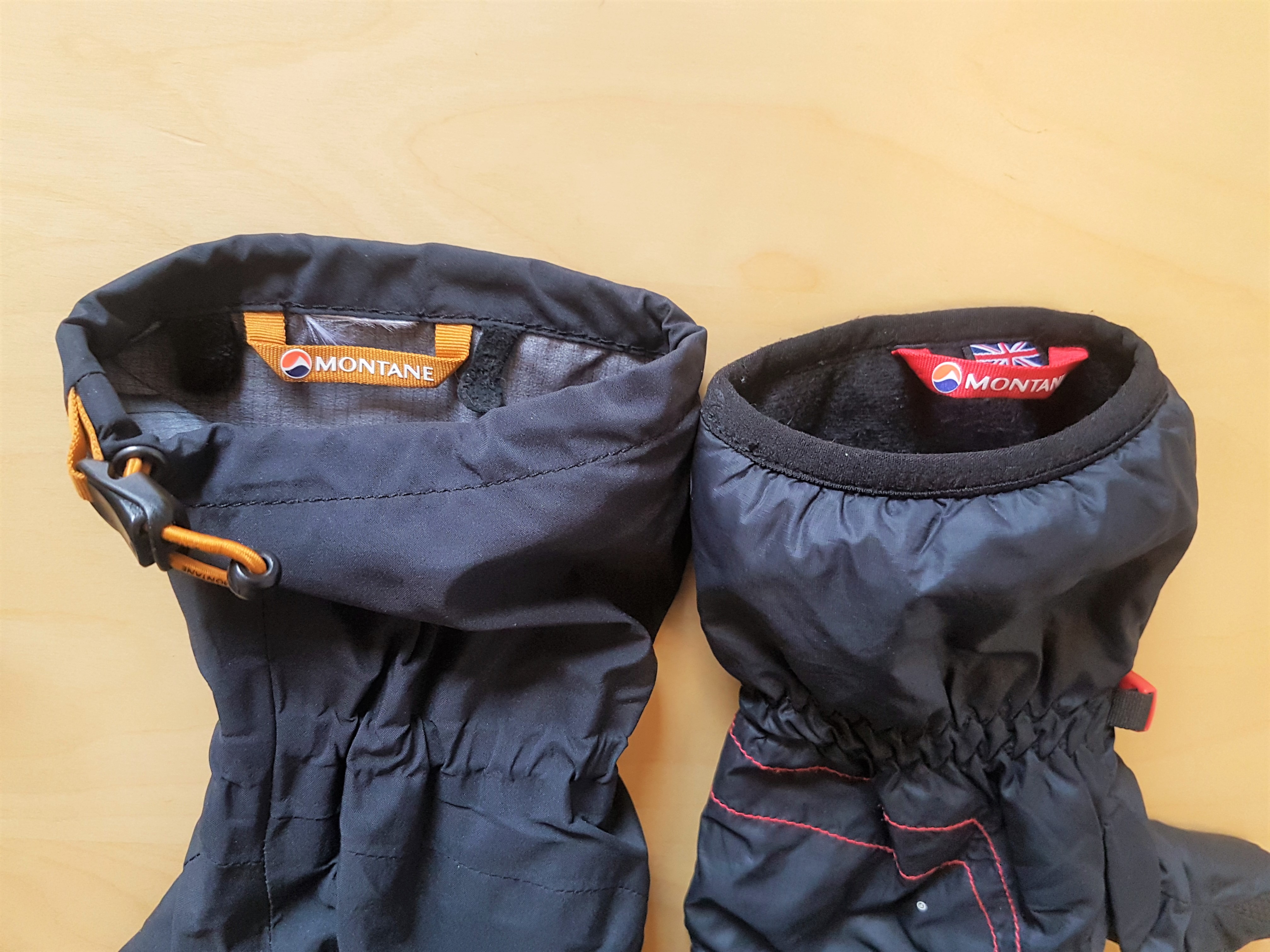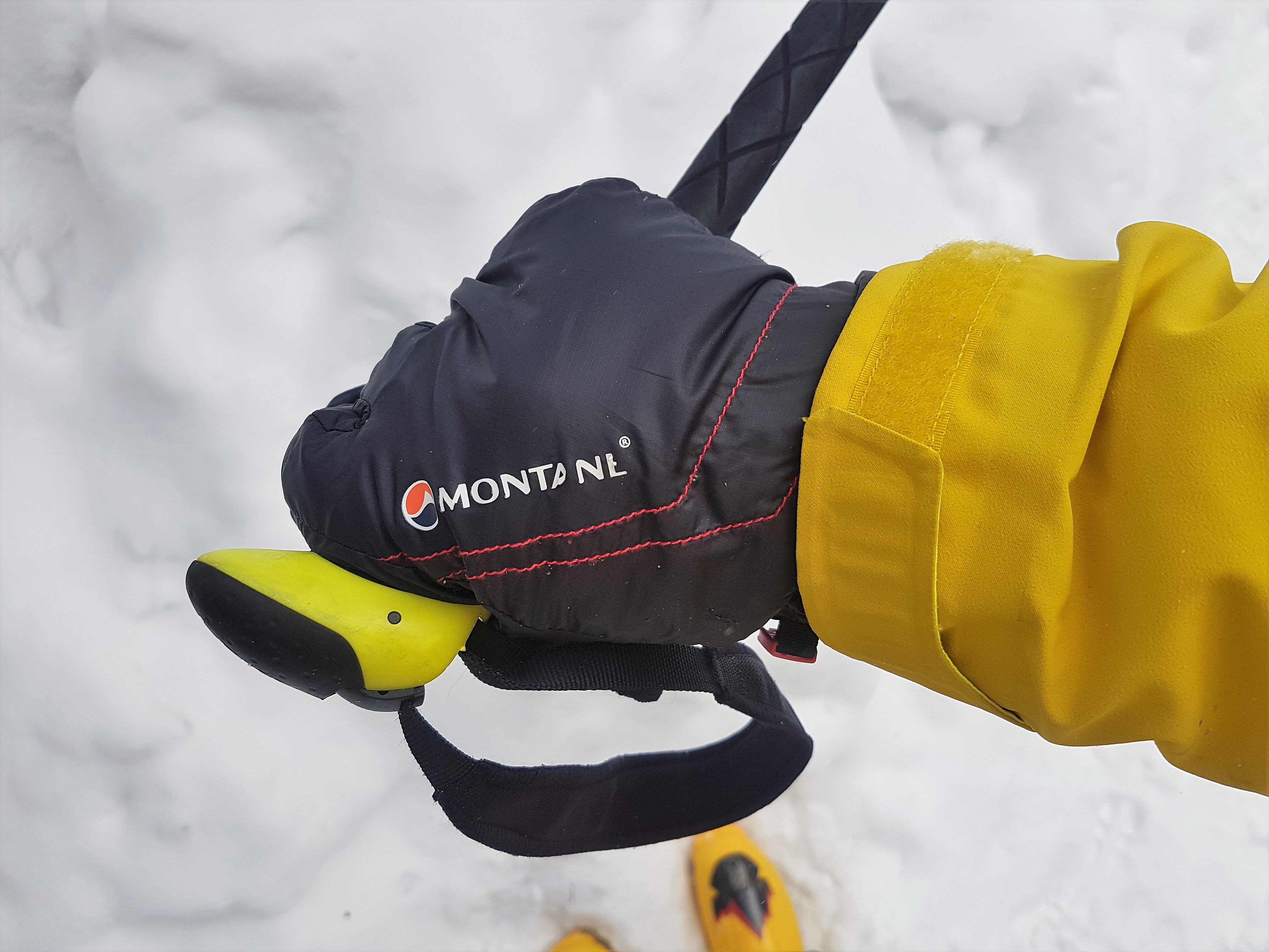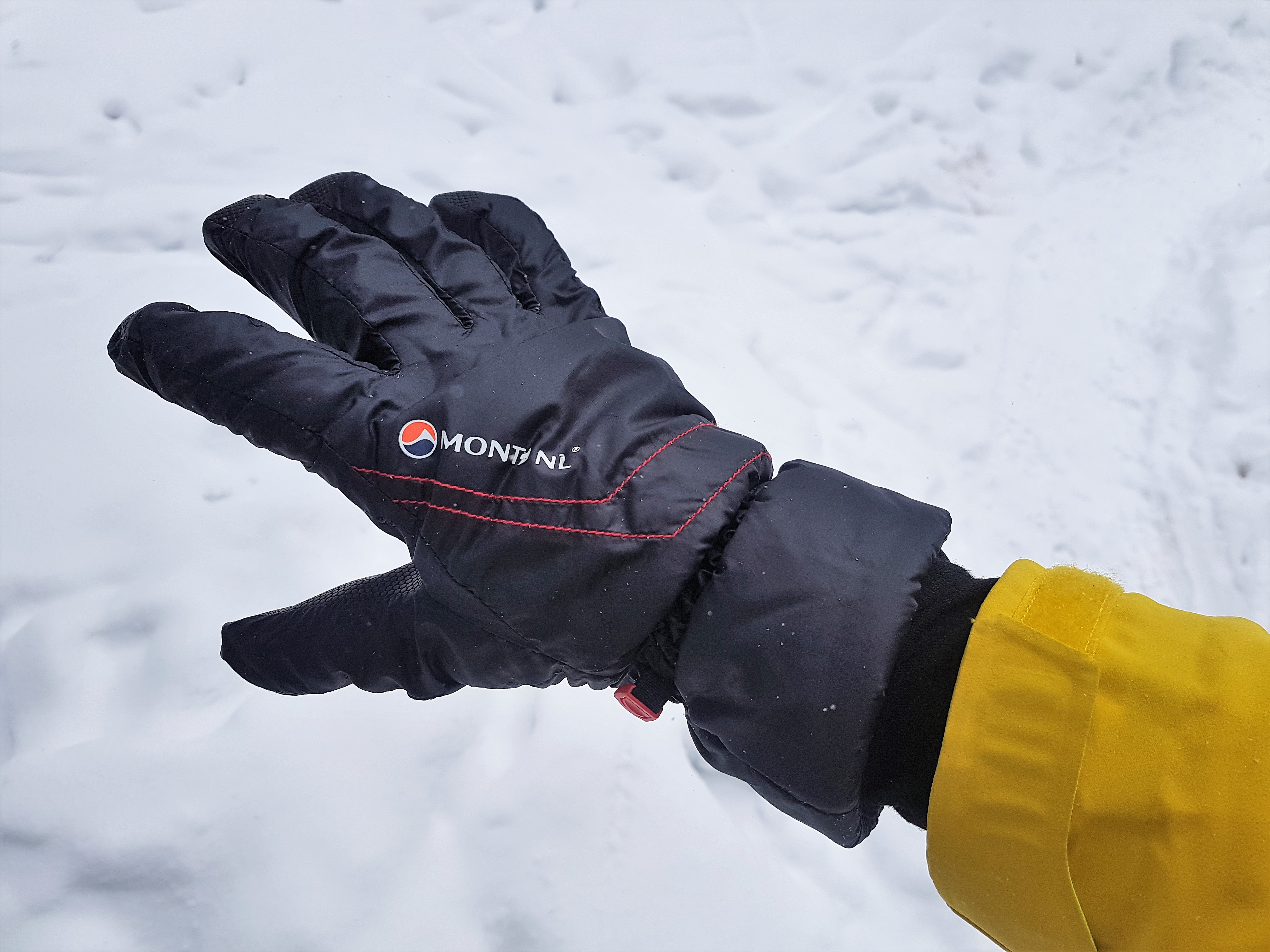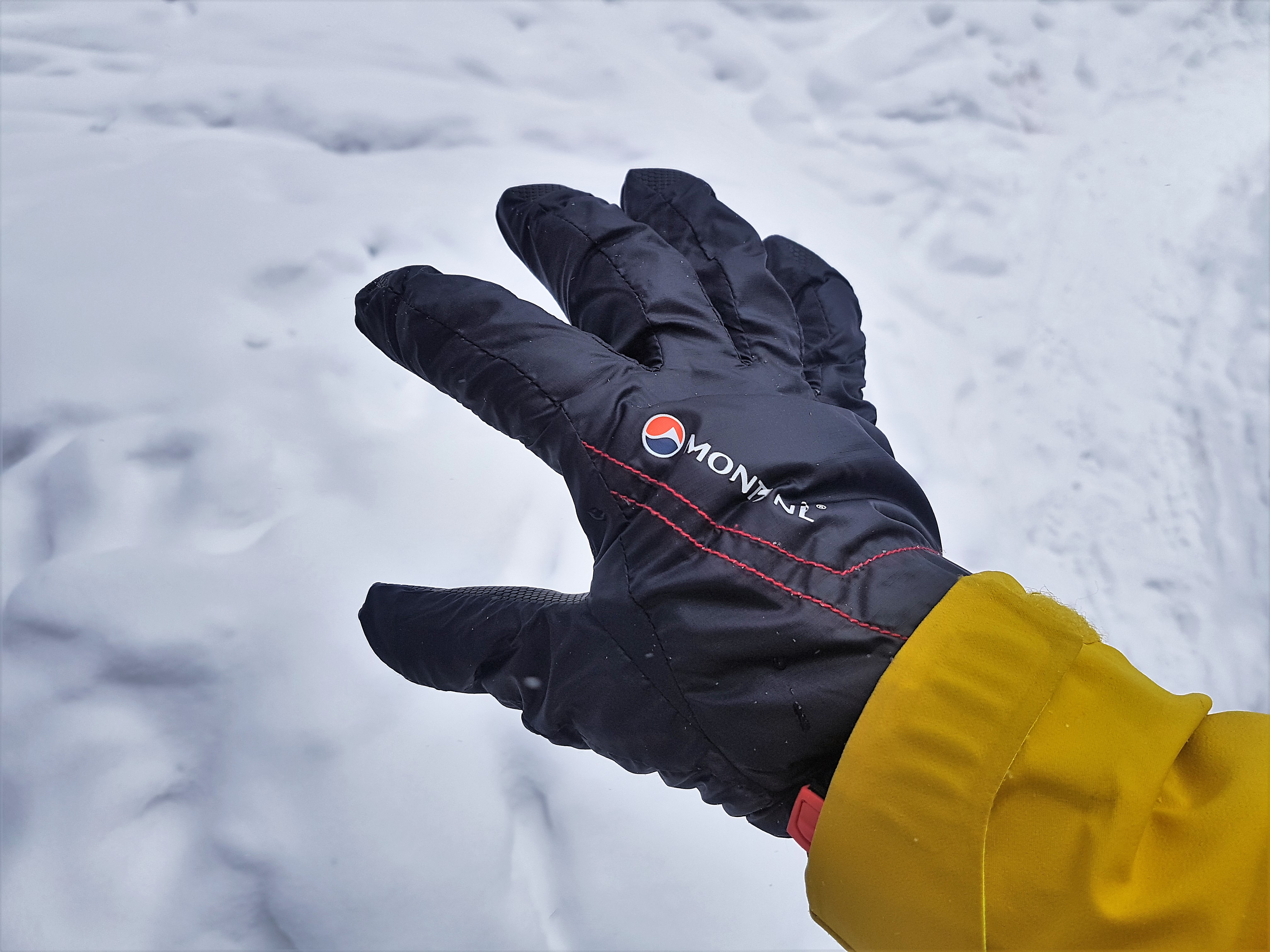 Te rękawiczki NIE mają wodoodpornej membrany i przy takim doborze tkaniny i ociepliny to bardzo dobre rozwiązanie. Rękawiczki Montane są wykonane ze znanej i cenionej od lat tkaniny Pertex Microlight – bardzo gęsto tkanego materiału wykorzystywanego głównie na poszycia śpiwór i kurtek puchowych. Wewnątrz rękawiczki jako warstwa cieplna pracuje 133g Primaloftu Gold ( 133 g – to waga 1 metra kwadratowego ociepliny a nie waga wypełnienia rękawiczek) – najlepszej i najszybciej schnącej obecnie ociepliny na rynku. Wewnętrzna strona rękawiczki jest wykonana z bardzo cienkiego, miłego w dotyku i szybko schnącego „polaru” czyli dzianiny poliestrowej. Para rękawiczek w rozmiarze L waży wraz z malutkim woreczkiem do którego się mieści zaledwie 100 g. Wnętrze dłoni jest wykonane z miękkiego i co bardzo ważne nie twardniejącego na mrozie Hypalonu – materiału niemalże niezniszczalnego który powszechnie jest stosowany do pasków pod podeszwy butów do stuptutów. Warto dodać że projektanci uniknęli częstego błędu za co należą im się brawa – rękawiczka nie ma po stronie dłoni żadnego szwu. To bardzo ważne, bo każdy szew prędzej czy później się wyciera od trzymania kijków trekkingowych czy pracy. Projektanci Montane zrobili wszystko aby te rękawiczki były lekkie i intuicyjne. Sama rękawiczka ma lekko podgięte palce i wnętrze dłoni. Rękawiczki nie posiadają regulowanego ściągacza na wysokości nadgarstka ani zaciąganego gumą mankietu na skraju. Nadgarstek jest ściągnięty za pomocą wszytego na stałe ściągacza gumowego który dobrze działa i nie uciska dłoni, a zewnętrzny obręb za pomocą elastycznej lamówki wszytej dookoła rękawiczki. Lżej się po prostu nie da. Rękawiczki mają również od środka wszyte ucho do którego możemy przyczepić gumkę czy sznurek aby ich nie zgubić.
